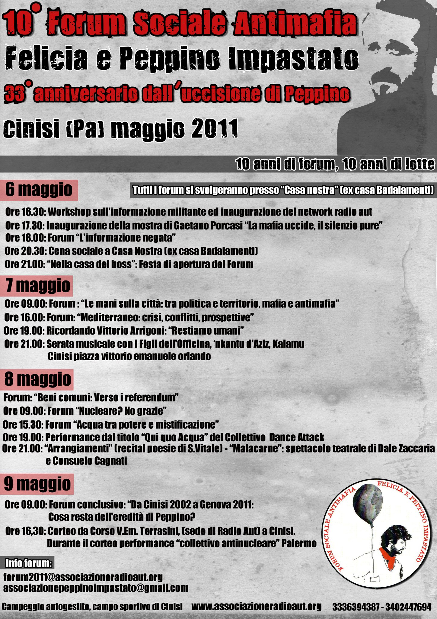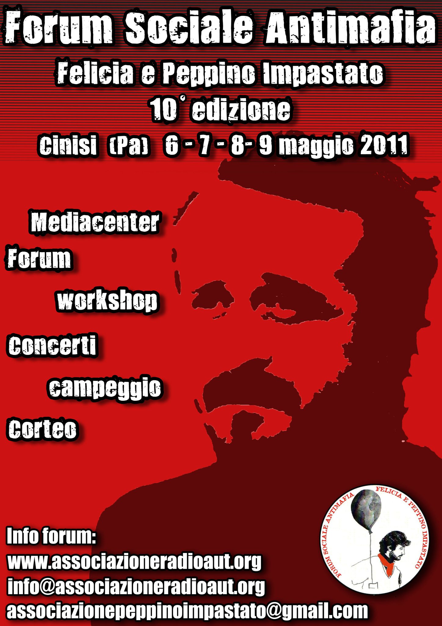 Assieme al 33° anniversario dell’assassinio di Peppino Impastato, quest’anno ricorre il decennale del Forum Sociale Antimafia che, malgrado alcune prese di distanza, nella crisi generalizzata dei movimenti di lotta, è una delle poche realtà, che ,“con le idee e il coraggio di Peppino”, resiste e cerca di tenere vivo l’antagonismo contro l’azione socialmente devastante dell’attuale ceto politico. La partecipazione è aperta a tutti quelli che vogliono impegnarsi nella costruzione dell’antimafia sociale, escludendo protagonismi e verità calate dall’alto.